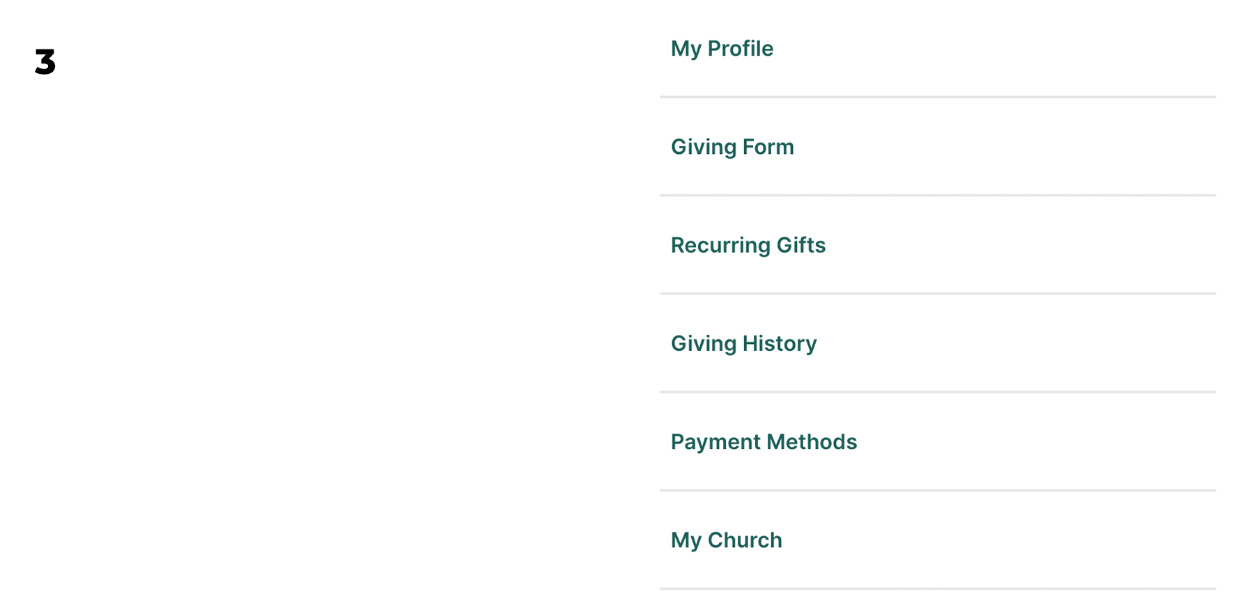 STEP 3 : From this screen you can view various account details. You can change your giving payment method, your tithe/giving history, giving screen, recurring giving, and our church info.